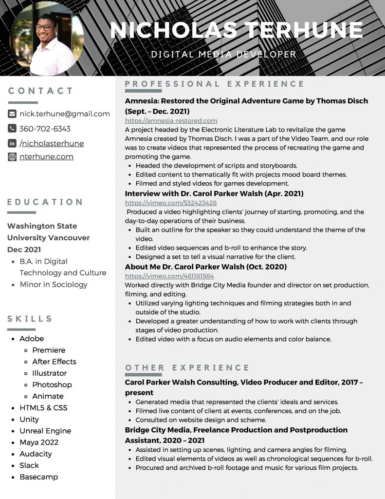 I have an eye for the creative and a passion for delivering results. With an uncanny empathy combined with a knowledge of design and photography, I create digital media that showcase the voice and unique gifts of people. I want my work to reflect the values of my clients better than their own words. With over five years of video editing experience and three years of managing teams, I have the ability to elevate talent and exceed client expectations.